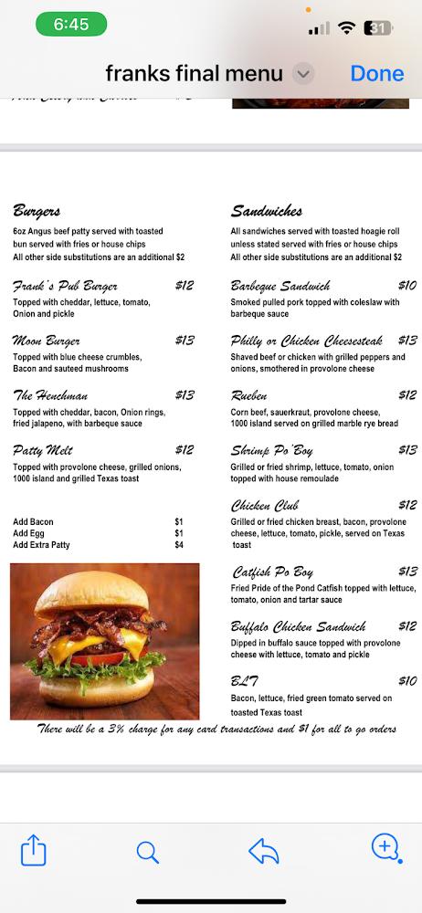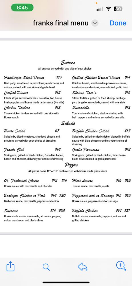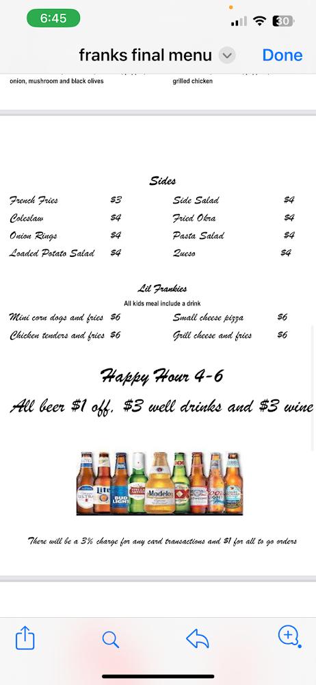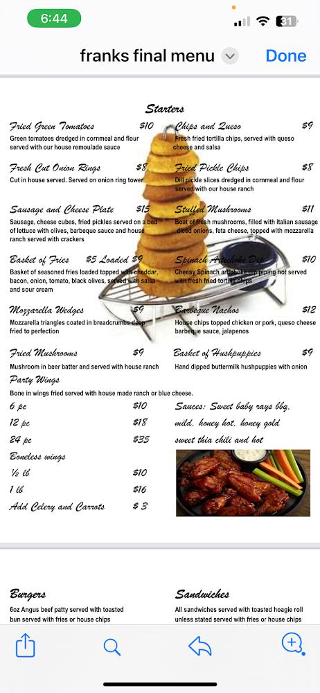 Entrees offer fulfilling choices such as BBQ sandwiches and Philly cheesesteaks. For lighter bites, tasty sides like salads round out the menu. The kids' menu ensures even the little ones have wonderful selections. Overall, Frank's focuses on fresh ingredients. Each plate delivers flavor and comfort in every dish, ensuring satisfaction with every meal.